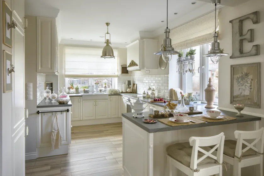 Szafki kuchenne zrobione przez lokalną firmę według projektu właścicielki to jedyny nowy mebel w domu. Okap Kasia ozdobiła dekorem z konglomeratu żywicznego. Kafelki metro i okap z oryginalnym dekorem nadają kuchni rustykalny charakter. Sielski styl przełamują loftowe lampy oraz srebrne tace powieszone na ścianie nad blatem.