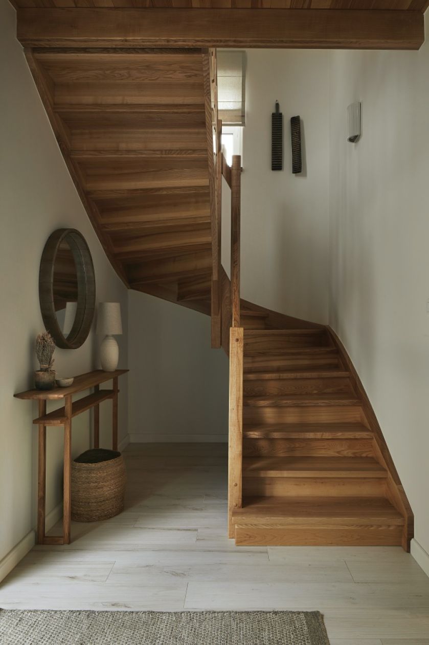 • drewniane schody w holu w stylu skandynawskim