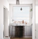 Stalowe szafki wydają się mniej chłodne w zestawieniu z ciepłymi deskami na podłodze. Ogromne okna wpuszczają dużo światła, które jest tu na wagę złota.