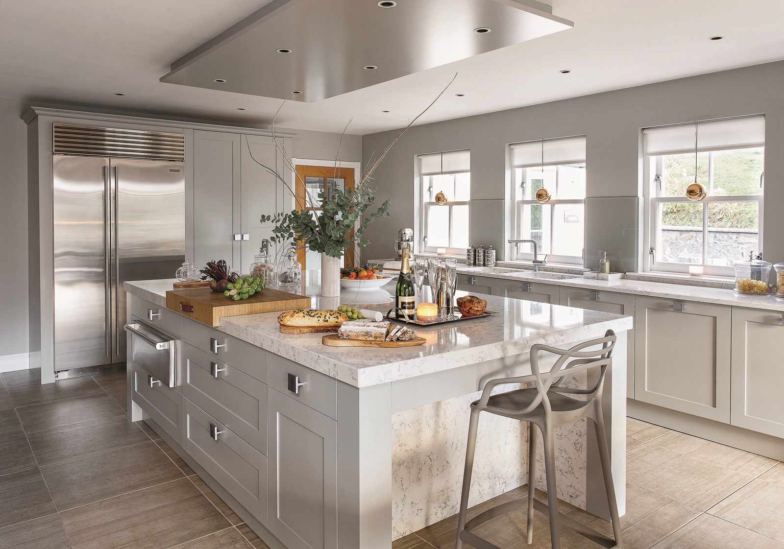 Blaty robocze w kuchni wyglądają na marmurowe, ale wykonane są z bardziej praktycznego konglomeratu kwarcowego Silestone. Tutaj króluje solidne AGD marki Wolf i Sub-Zero.