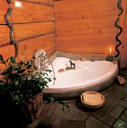 • Łazienka o ścianach z grubych bali sosnowych jest niezwykle przytulna i ciepła. Gdy leży się w wannie, słychać, jak
