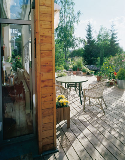 • Drewnianego tarasu nie otaczają żadne barierki, jedynie rośliny w donicach. To daje poczucie przestrzeni.