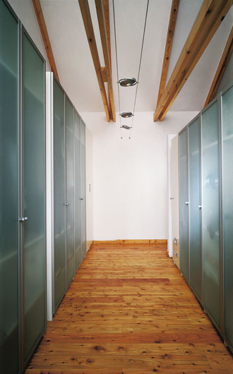 • Przy najbardziej nasłonecznionej ścianie powstała garderoba, stanowiąca doskonałą izolację. Dzięki temu w upały