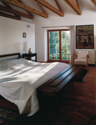 Pomysł na balkon w sypialni zrodził się dopiero podczas budowy. Architekci uznali, że przyjemnie będzie rano odetchnąć świeżym powietrzem i rozejrzeć się po okolicy.