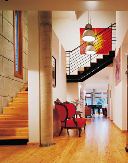 • Mieszanka stylów i materiałów przynosi nieraz nadspodziewane efekty. Ciekawostką w holu jest betonowy słup, który