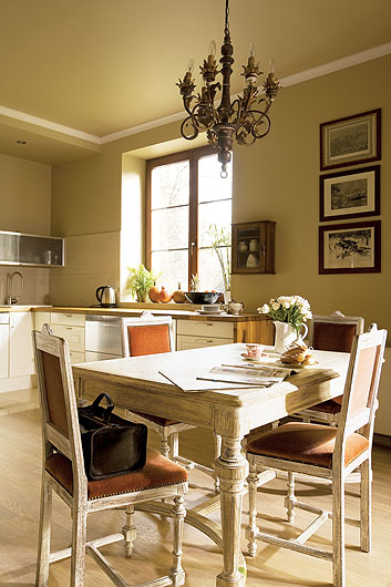 Stół i krzesła projektantka znalazła na Allegro, a drewniany żyrandol przyjechał z antykwariatu w Padwie. Na ścianie wisi rycina Alfreda Wierusza-Kowalskiego.