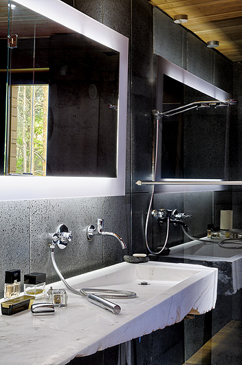 • Do budowy zastosowano naturalne materiały: drewno, biały kamień, czarną wulkaniczną lawę, stal aluminium i szkło.