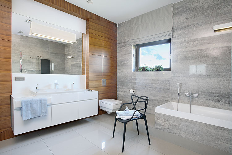 • Nowoczesne materiały: gres, marmur, sporo szkła, odrobina drewna.