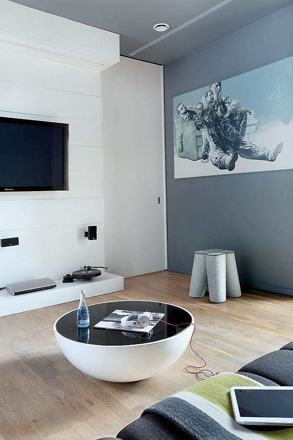 • Wśród ciemnych ścian lepiej ogląda sie filmy. Dominującą czerń przełamuje filcowy stołek oraz żółta poducha