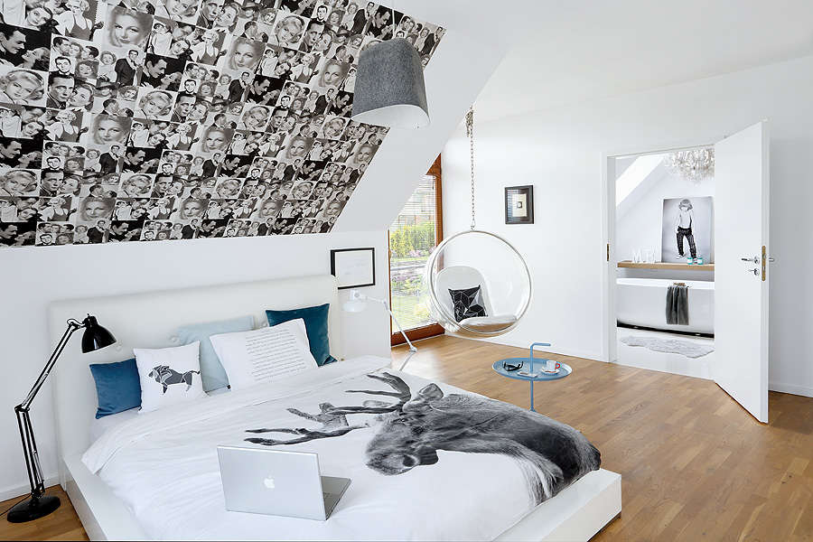 Tapeta z Bogartmem i Clarkiem Gable'em i jest o kim śnić. Do kompletu fotel bubble i pościel w renifery marki By Nord.