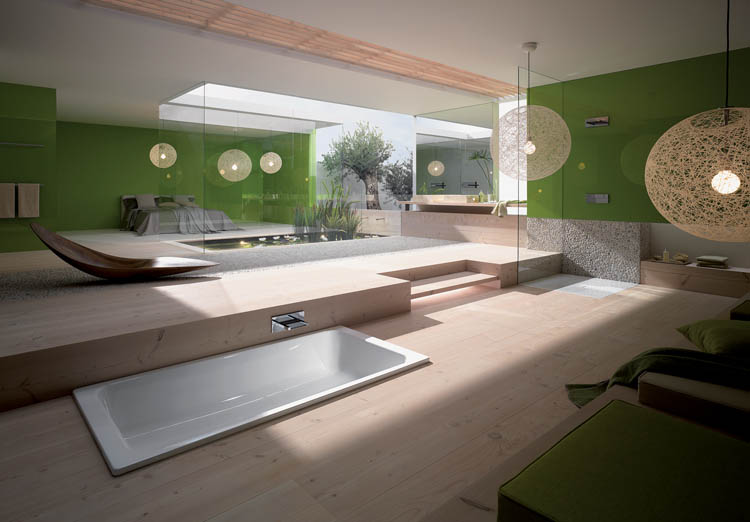W tej łazience emaliowaną wannę Bassino (10 783 zł) wpuszczono w podłogę. KALDAWEI