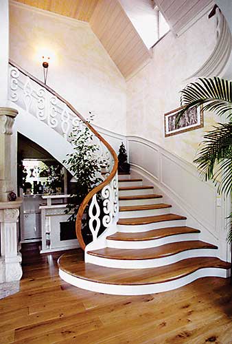 • Schody z litego drewna wykończone półokrągłymi stopniami. Balustrada z kutego żelaza. PRACOWNIA SCHODÓW PAZURA