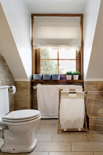 • Naturalne kolory i materiały sprawiają, że łazienka gospodarzy jest przytulna. Nawet glazura fakturą przypomina drewno.