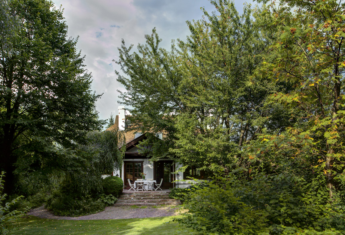 • Widok na dom z ogrodu. Drewniany dworek po latach