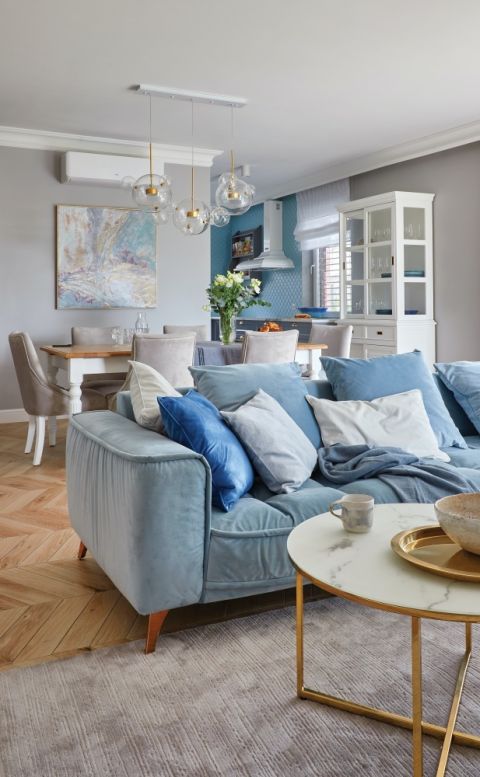 Dom miłośniczki Nowego Jorku – eleganckie, lekkie i przytulne wnętrza w szarościach i błękitach