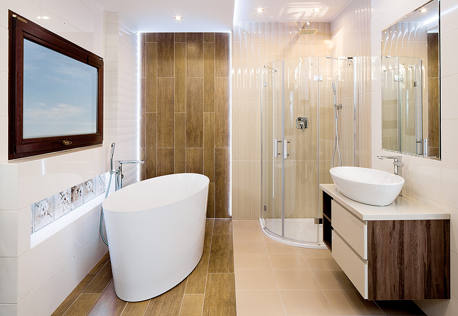 Pierwsze skrzypce gra tutaj wanna i płytki imitujące drewno, OMNIRES