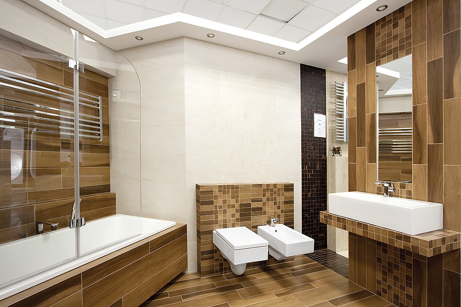 • Ścianka obok wanny wyłożona jest mozaiką, ale nie drewnianą, tylko gresową. Kolekcja Livingstone w cenie 44,9 zł za sztukę,