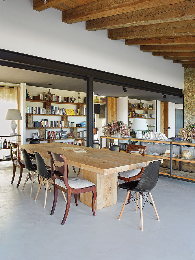 Eklektyczna jadalnia: betonowa podłoga, drewniany stół, artdecowskie i nowoczesne krzesła.