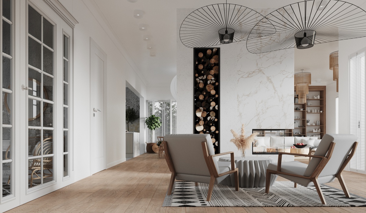 Klara i Mateusz marzyli o tym, aby mieć dom nowoczesny, z otwartymi przestrzeniami i dużą ilością światła. Jednocześnie chcieli wnętrza ciepłego, łączącego styl klasyczny z naturalnymi materiałami, takimi jak drewno i kamień.