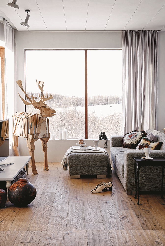 Margaret urządziła wnętrza w szarościach i drewnie, w stylu skandynawskim. Ma nie tylko fantastyczny widok z okna. Wystarczy, że wyjdzie z domu, założy narty i od razu rusza na stok.