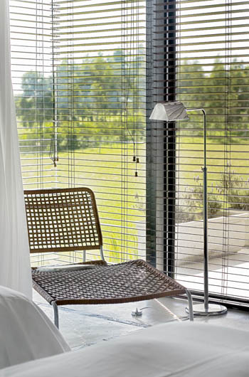 • W całym domy jest dużo przeszkleń - wielkie szklane tafleł ączą wnętrze z otaczającym krajobrazem.