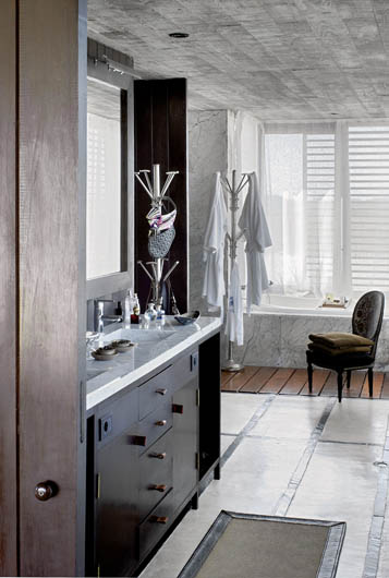 • Ciekawa mieszanka materiałów pospolitych ze szlachetnymi. Surowe dechy w sąsiedztwie chłodnego marmuru stają się bardziej