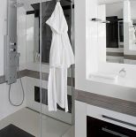 • Prosta, ale efektowna łazienka dla gości. Ciekawe połaczenie płytek i forniru. Umywalka oraz wanna z Duravitu.
