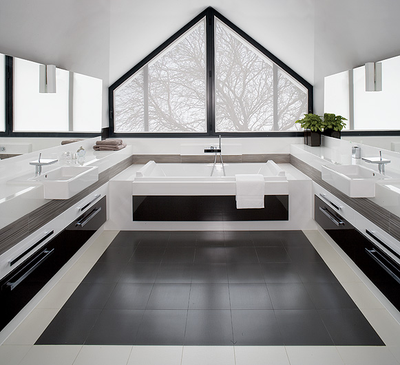 • Prosta, ale efektowna łazienka dla gości. Ciekawe połaczenie płytek i forniru. Umywalka oraz wanna z Duravitu.