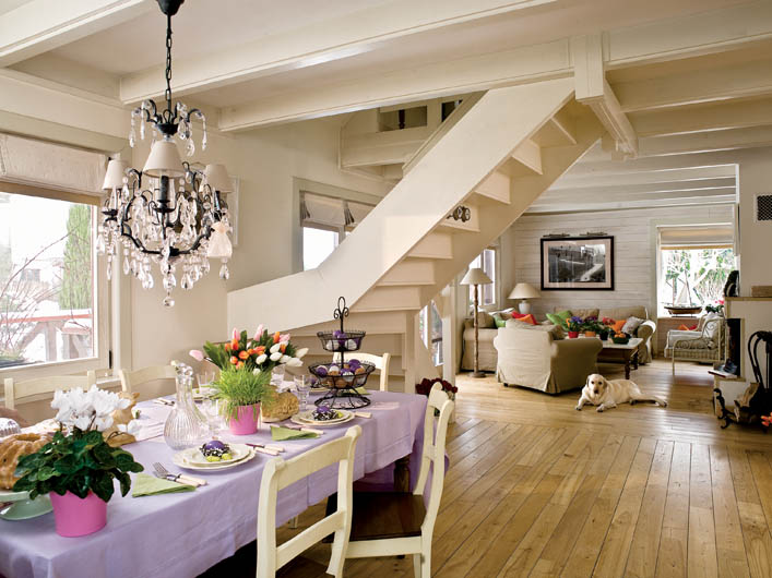 • Pobielane jesionowe podłogi, belkowany sufit, białe ściany, gdzieniegdzie krem i beż.