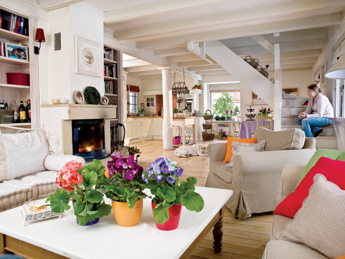 • Pobielane jesionowe podłogi, belkowany sufit, białe ściany, gdzieniegdzie krem i beż.