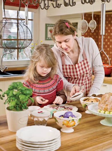 • Pięcioletnia Ninka, z pomocą mamy, ozdabiają świeżo upieczone kruche ciasteczka kolorowym lukrem.