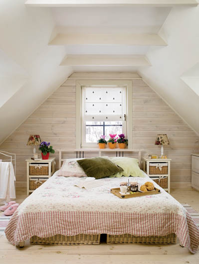 • Pobielane jesionowe podłogi, belkowany sufit, białe ściany, gdzieniegdzie krem i beż.