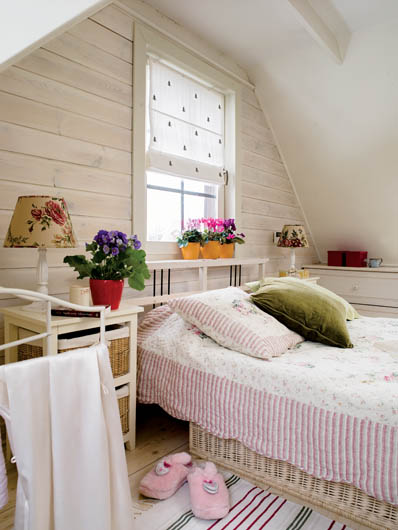 • Pobielane jesionowe podłogi, belkowany sufit, białe ściany, gdzieniegdzie krem i beż.