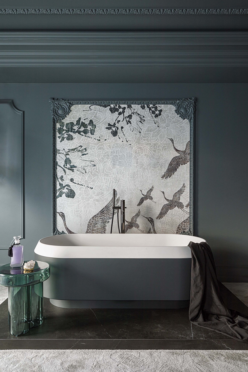 • elegancki salon z turkusową ścianą ozdobioną sztukaterią
