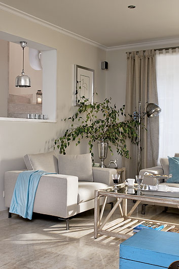 • Kremowe sofy, fotele i kawowy stolik z turkusowymi dodatkami.