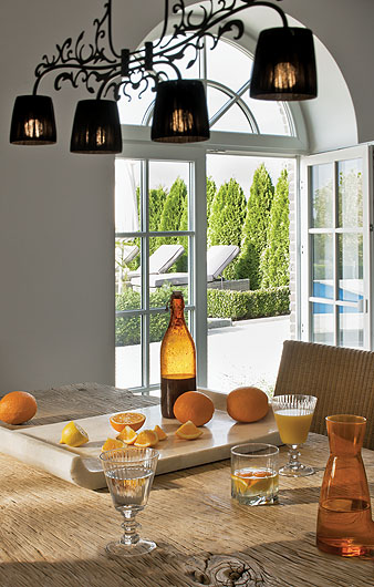Biało-czarna (biała laka, czarny granit) nowoczesna kuchnia wycisza rozmach reszty domu. Ale nie brak w niej ciepłych akcentów: pasiastej tapety czy chińskiego stołu ze starych drzwi wiązowych.