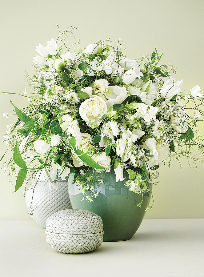 • Do kompozycji z białych kwiatów warto dodać pojedycze zielone akcenty: liście babki, gałązki kolendry czy