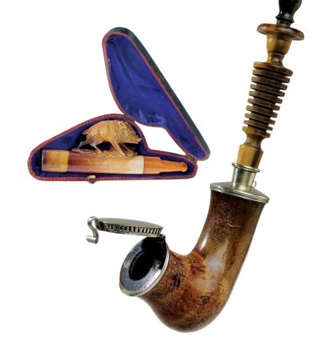 Cygarniczka sepiolitowa z bursztynowym ustnikiem, Niemcy, XIX/XX w., Muzeum Dzwonów i Fajek w Przemyślu, fot. Piotr Chen. Fajka z rogu, popularna w Anglii w XVIII w., FORUM
