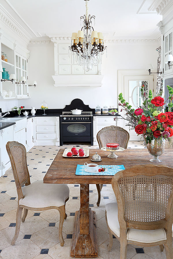 • Meble kuchenne ze zdobieniami, do których nawiązują także sztukaterie.