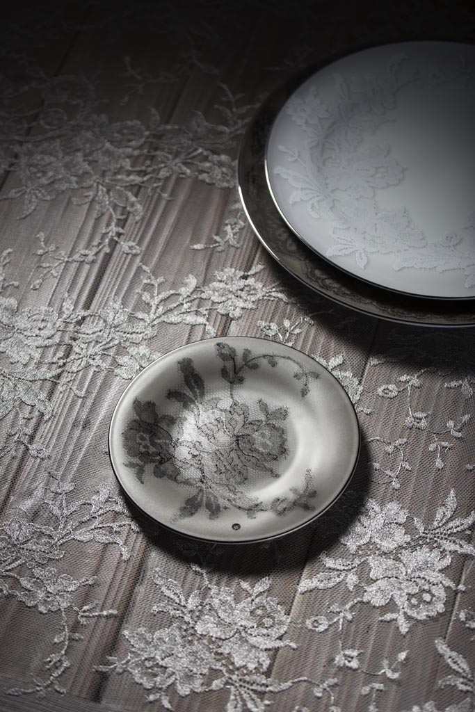 Wypukły wzór francuskiej koronki przepięknie prezentuje się także na porcelanowych talerzach z serii Lace Platinum, które połyskują na stole niczym najpiękniejsza biżuteria. Przepiękny srebrzysty talerz dekoracyjny oraz talerzyk na przys