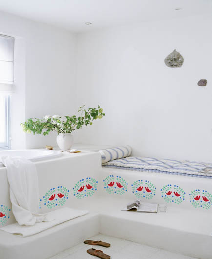 Najsłynniejszego gołębia stworzył Pablo Picasso – uproszczony granatowy rysunek na białym tle. Postanowiliśmy wykorzystać ten motyw w naszych freskach. Ale zamiast jednego ptaka proponujemy parkę. Dodaliśmy też kolory i w ten sposób fresk nabrał wyrazu. Świetnie ożywi zwłaszcza pastelowe wnętrza.Potrzebne będą: farby: granatowa, czerwona i zielona (jasna i ciemna) tampony z gąbki Jak korzystać z szablonuNajpierw wydrukuj szablon na zwykłej kartce, a