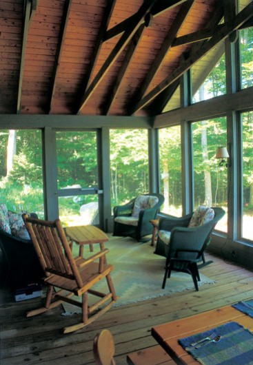 Na ogromną werandę prowadzą rozsuwane przeszklone drzwi. Ściany z drobnej metalowej, niemal niewidocznej siateczki nie tylko chronią przed owadami, ale i dają złudzenie, że siedzi się pośród lasu.