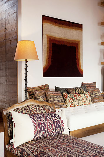 • Ubrana we wzorzyste bawełny przywiezione z Azji. Obok łóżka postawił totem, prezent urodzinowy od przyjaciół - narciarzy.