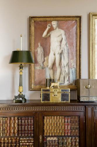 W komodach ustawione zostały grzbiety fałszywych książek.