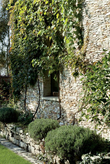 • Po ścianach z łupka pnie się winobluszcz, winorośl i glicynia.