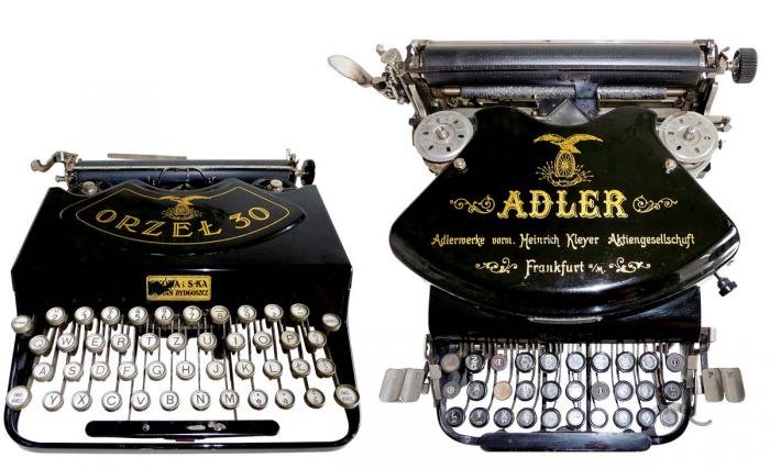 Polski Orzeł 30 z 1927 r., przenośna maszyna walizkowa poznańsko-bydgoskiej firmy Skóra i Spółka, kolekcja Wojciecha MszycyNiemieckiego Adlera 7 produkowała w latach 1900-1938 firma Heinricha Kleyera z Frankfurtu nad Menem, kolekcja Wojciecha Mszycy