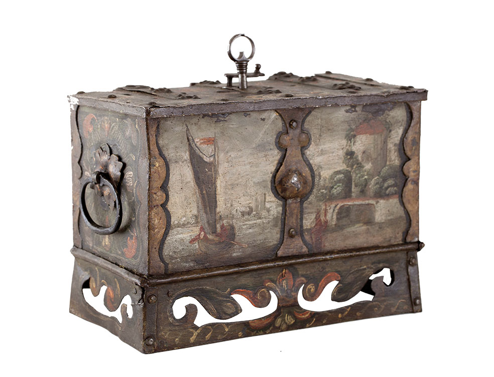 • Drewniany, ręcznie malowany skarbczyk z 1615 r.