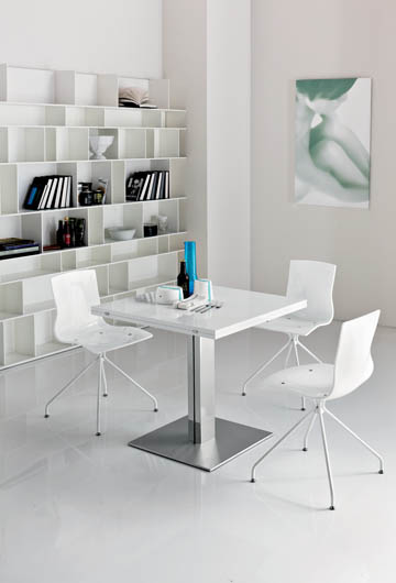 • Noga rozkładanego stołu Elvis Turn (1532 euro) zrobiona jest z nierdzewnej stali. Krzesła Lola kosztują