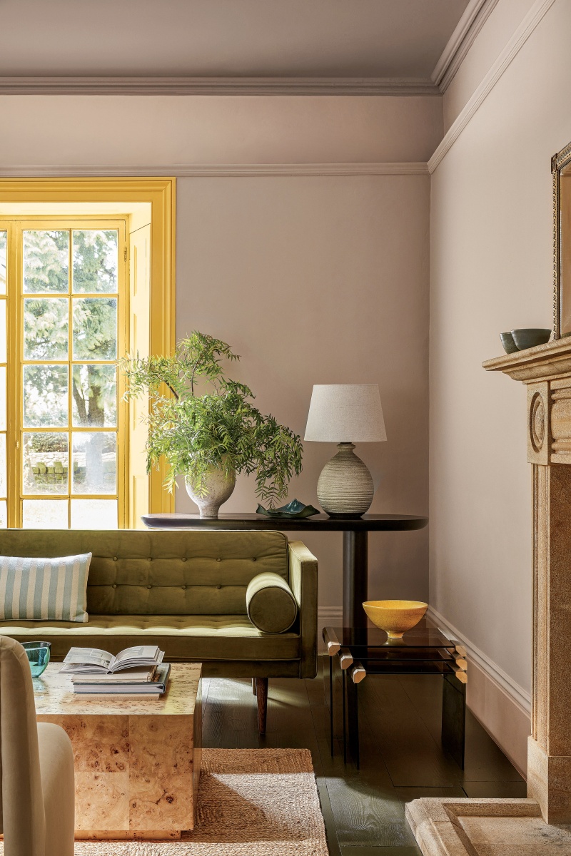 Miks dwóch pokrewnych odcieni przełamany kontrastowym, mocnym akcentem: Blush (na suficie), Masquerade (na ścianach) i Light Gold (na stolarce okiennej), littlegreene.com