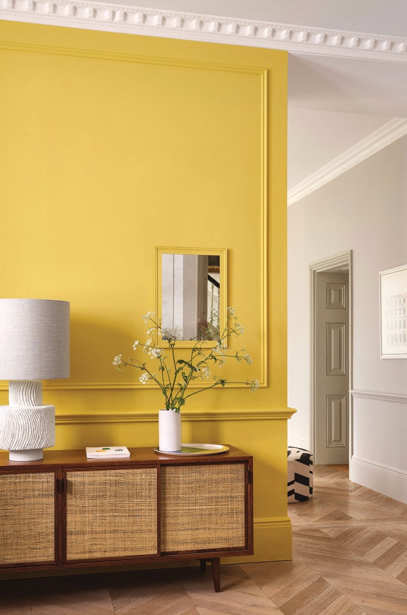 Kolor do pokoju od wschodu i północy: Brimstone 476, czyli „płonący kamień”, nowoczesny, średnio nasycony żółcień z kolekcji Pure Flat Emulsion, idealny do stosowania na dużych powierzchniach, paintandpaperlibrary.com
